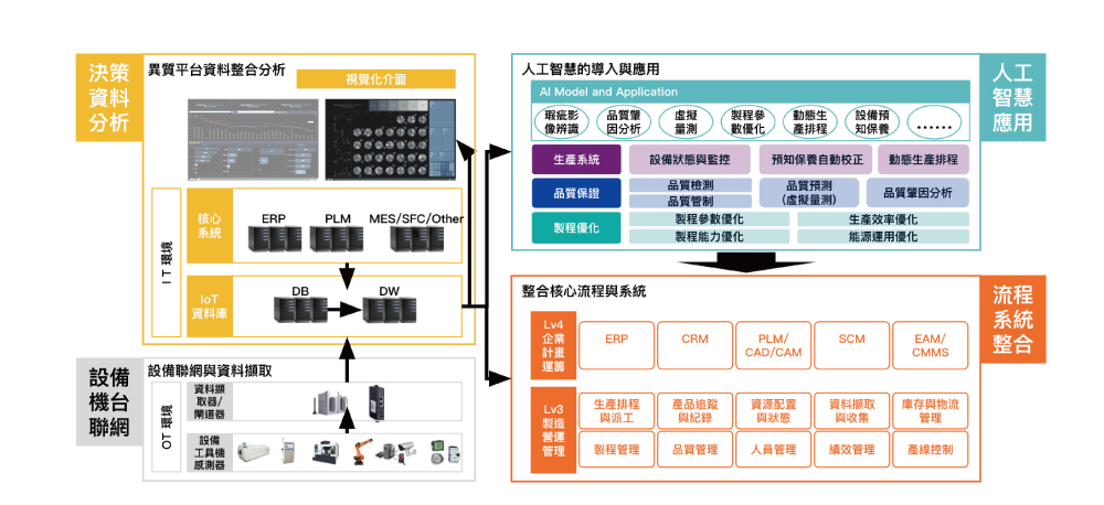 ・系統整合IT與OT資訊, OT資訊包括生產設備稼動/產能、SCADA環控/廠務設備、CCTV系統即時影像。IT資訊包括ERP訂單/財務/成本資訊與MES系統工站產能資訊。